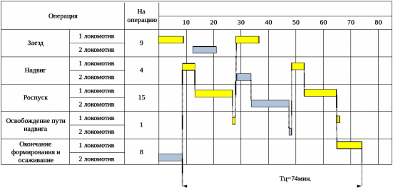 Рис. 4.1. Технологический график работы механизированной горки при двух горочных локомотивах и осаживании двумя локомотивами