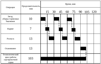 На основании расчетов строится график работы сортировочной горки с одним путем надвига при работе по расформированию состава поезда, который представлен на рисунке 4.2.