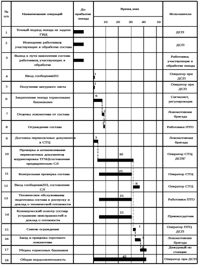 Прием и сдача локомотива и грузовых документов удостоверяется подписями в маршрутах машинистов с указанием времени оформления передачи. Локомотивная бригада, прибывшая с поездом, один экземпляр натурного листа передает маневровому диспетчеру. Порядок операций и норм времени на обработку поезда указаны на рисунке 4.1.