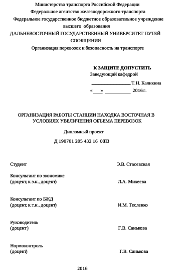 Дипломный проект студента Стасевской Эвелины Витальевны на тему «Организация работы станции Находка - Восточная в условиях увеличения объема перевозок» выполнен в установленные сроки, согласно заданию.
