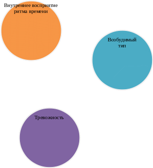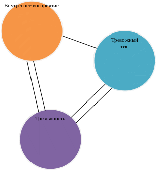 Рис. 4 Корреляционная плеяда между внутренним восприятием ритма времени, тревожности и тревожным типом акцентуации
