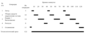 – технологическое время на расстановку вагонов для устранения несовпадения продольных осей автосцепки и постановку вагонов прикрытия в соответствие требованиям ПТЭ. Определяется по формуле, мин. [4]: