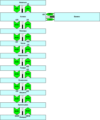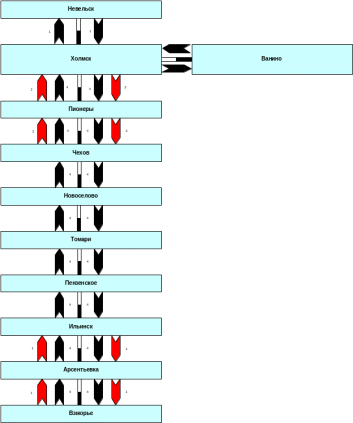 На основании объемов вагонопотоков строиться диаграмма поездопотоков (рис 2.2).