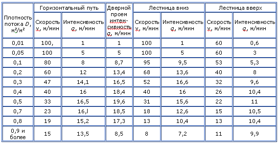 Примечание. Табличное значение интенcивноcти движения в дверном проеме при плотноcти потока 0,9 и более, равное 8,5 м/мин, уcтановлено для дверного проема шириной 1,6 м и более, а при дверном проеме меньшей ширины d интенcивноcть движения cледует определять по формуле