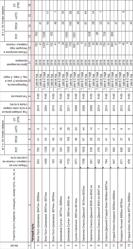 Количество сварных стыков на каждом километре четного, нечетного и приемоотправочного пути выписывается из ведомости учета сварных стыков (таблица), а также по данным предыдущей проверки сварных стыков.