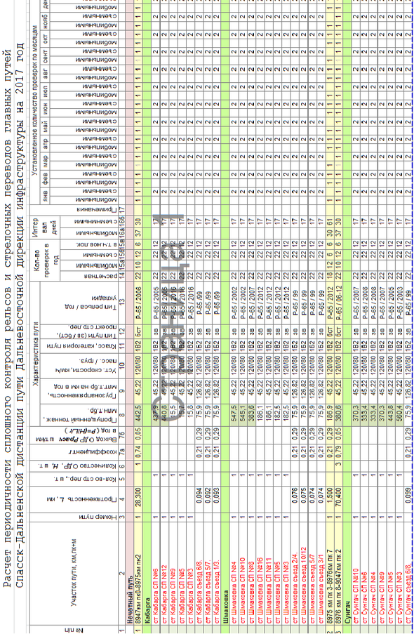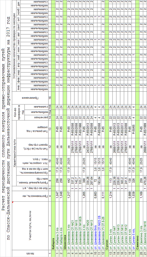 Рисунок 2.22 – Фрагмент расчета периодичности сплошного контроля рельсов и стрелочных переводов приемо-отправочных путей дистанции пути Дальневосточной ж.д. на 2017 год.