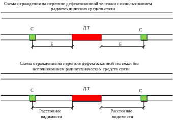 При производстве работ на закрытом для движения поездов перегоне или ограждения места работ сигналами остановки во время прохода поезда по соседнему пути работы прекращаются. Схемы ограждения дефектоскопной тележки при работе на перегоне приведены на рисунке 5.1.