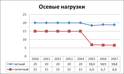 Осевые нагрузки за период с 2010 по 2017 год по Спасск-Дальненской дистанции пути