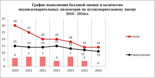 Рисунок 1.11− Балловая оценка неудовлетворительных километров в период с 2010 по 2016 гг.