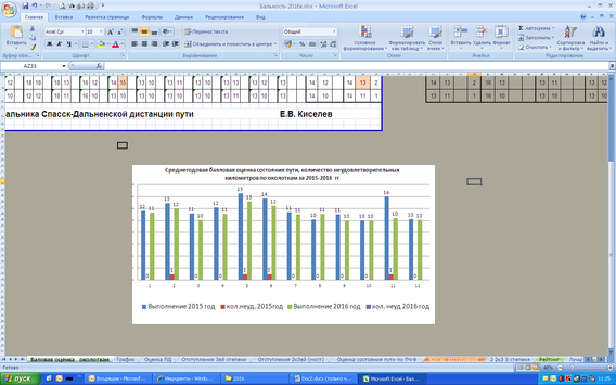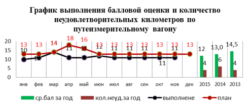 Бальная оценка ИССО по акту осеннего осмотра – 3,69 / 3,91 (сост. / сод.), всего выявлено 642 замечания, требующих устранения до 01.04.17 – 194 замечания (путейских 49, мостовых 145).Всего устранено 102 замечания (53%) из них на 01.01.17 устранено путевой бригадой 32 – 65,3%, мостовой бригадой 70 -48,2 %.
