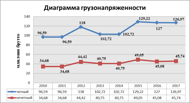 Грузонапряженность за 2017 год составила: четный путь −126,97 млн. тонн брутто;