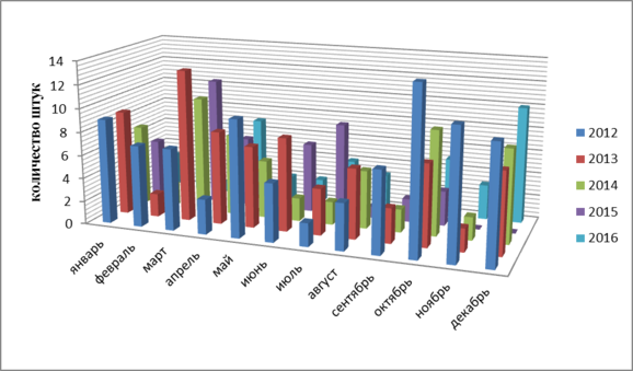 Количество ОДР выявленных в период с 2012 по 2016 годы по месяцам представлено в таблице 2.4 и на рисунке 2.9