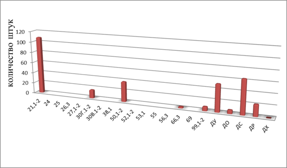 Из рисунка 2.7 видно, что резко выделяется выход рельсов по коду дефекта 21.1-2 в течение всего исследуемого времени - 91 шт., на втором месте по количеству изъятых из пути остродефектных рельсов дефект в стыке ДС - 45шт. и на третьем дефекты усовика крестовины– 37 шт.