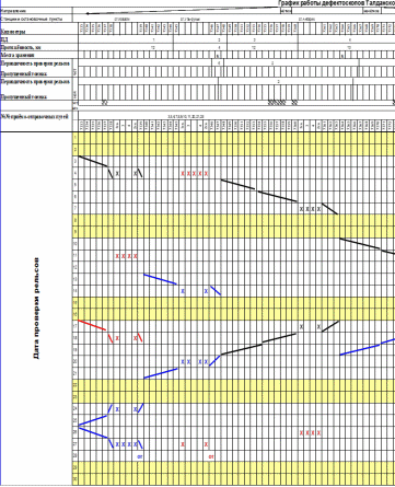 График работы составляется на основе расчёта периодичности для главных путей, приёмо-отправочных путей, стрелочных переводов лежащих на главных и приёмоотправочных путях, сварных стыков.