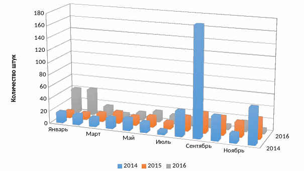 Рисунок 2.5 Изменение количества дефектных рельсов лежащих в пути за 2014 - 2016 годы