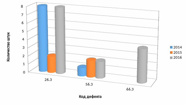 Таблица 2.14 - Количество сварных стыков выявленных по кодам дефектов в период с 2014 по 2016 годы: