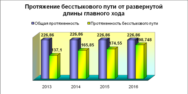 По состоянию на 01.01.2017 года протяжение главных путей не изменилось и составляет 226,863км, из них с рельсами: