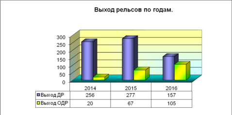 Рисунок 1.3 – Изменение количества остродефектных и дефектных рельсов с 2014 по 2016 год