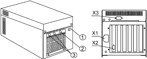 На лицевой панели размещены: выключатель питания 1, кнопка аппаратной перезагрузки 2, индикаторы питания и работы 3.