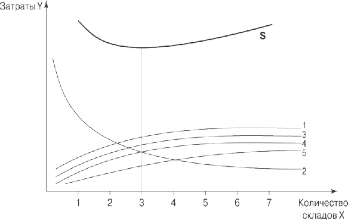 Рост количества складов обеспечивает снижение расходов в расчете на каждый склад (эффект масштаба), но совокупные эксплуатационные затраты на содержание всего складского хозяйства возрастают (кривая 4).