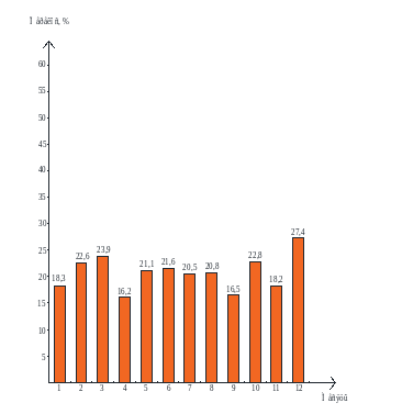 На основе, представленной диаграммы (рисунок 3.7) можем сделать вывод, что самыми неблагоприятными по количеству отступлений по перекосам пути, является месяцы: декабрь, март, октябрь.