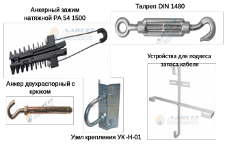 Натяжные зажимы применяются в местах поворота трассы, при спуске кабеля со здания на опору, при вводах в здание, а также на прямых участках трассы для соблюдения стрелы провеса кабеля. Натяжной метод основан на анкерных зажимах и талрепах.