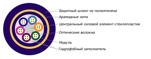 Кабель содержит центральный силовой элемент из стеклопластика (Д) или изолированного полиэтиленом стального троса (М), вокруг центрального силового элемента скручены оптические модули с волокнами и кордели. Центральный силовой элемент обмотан водоблокирующими нитями. Свободное пространство в оптических модулях заполнено гидрофобным заполнителем. Межмодульное пространство заполнено гидрофобным заполнителем или поверх скрученных оптических модулей и корделей наложена водоблокирующая лента. На сердечник наложена внутренняя оболочка из полиэтилена (ПЭ). Допускается изготовление кабеля без внутренней оболочки с периферийным силовым элементом из стеклонити. На оболочку методом обмотки наложен периферийный силовой элемент (ПСЭ) из арамидных нитий или стеклонитей. На ПСЭ наложена наружная оболочка из ПЭ.