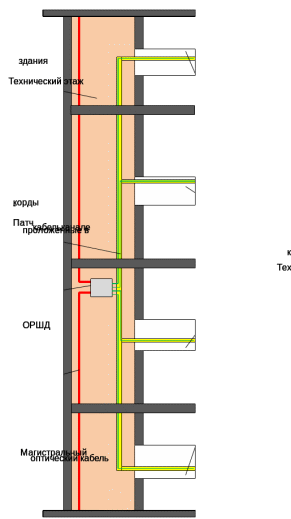 ОРШП будут устанавливаться на третьем этаже, что также оптимизирует максимальную длину патч-кордов которые будут протягиваться до квартиры и оборудования ONT(рисунок 3.6.4.).