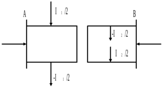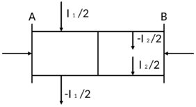 Расчеты потерь энергии для двухпутных участков значительно сложнее, а расчетные формулы зависят от схемы питания контактной сети. Однако эти затруднения можно преодолеть, использовав методику расчета мгновенных схем методом наложения. На рисунке 1.3, 1.4 приведена последовательность преобразования мгновенных схем для двухконсольной схемы двустороннего питания двухпутного участка. Для определенности рассмотрим схемы кольцевого питания (для двухконсольной схемы) и узлового питания (для схемы двустороннего питания), при расчете мгновенных схем по методу наложения исходная схема заменяется двумя схемами замещения: рисунок 1.3б, рисунок 1.4б, где ток каждого поезда уменьшается в два раза и разнесен на оба пути и схемой рисунок 1.3в, рисунок 1.4в, где направление тока «чужого» пути изменено на противоположное. Нетрудно заметить, что при наложении токов с