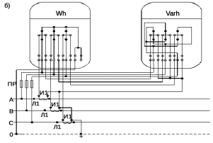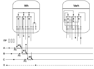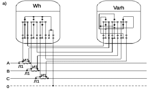 Для каждой электроустановки должна быть утверждена в установленном порядке схема (на рисунке 7.1 приведены схемы подключения двухэлементных счетчиков активной и реактивной энергии, на рисунке 7.2 двухэлементных счетчиков) размещения приборов расчетного и технического учета электроэнергии, соответствующая полному вводу электроустановки в эксплуатацию в соответствии с проектом.