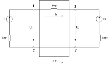 Е1, Е2 - ЭДС холостого хода фазы, питающей межподстанционную зону, соответственно на ТП1 и ТП2; Zвх1, Zвх2 - входные комплексные сопротивления питающей системы по отношения в тяговым трансформаторам соответственно на ТП1 и ТП2, Ом; Zт.с - эквивалентное комплексное сопротивление тяговой сети, Ом; Iу - комплексное действующее значение уравнительного тока, А; U1, U2 - комплексные действующие значения напряжений на шинах тяговых подстанций фазы, питающей межподстанционную зону, соответственно от ТП1 и ТП2, В.