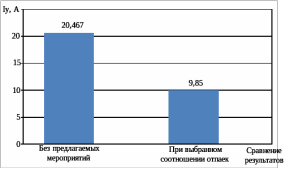 Из рисунка 5.3 наблюдается заметное снижение значения уравнительного тока при применении разработанных мероприятий. При выбранном соотношении отпаек значение уравнительного тока снизилось в 2,3 раз. Таким образом, оптимизация условий работы параметров (отпаек) РПН позволяет добиться практически полного исключения уравнительного тока на участке Спасск - Сибирцево.