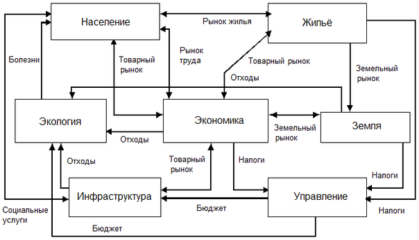 Для решения широкого спектра задач развития субъекта РФ можно использовать подход Дж. Форрестера, но выделение его подсистем и взаимосвязей должно быть более полным. Согласно этой концепции, следует выделить подсистемы, которые, в свою очередь, также могут быть рассмотрены как отдельные системы: население, жильё, экономика, экология, земля, инфраструктура, управление. Для обоснования выбора названных подсистем рассмотрим последовательно их содержание и взаимосвязь. При этом для наглядного представления этой процедуры представим содержание каждой подсистемы и построим концептуальную модель субъекта РФ (рисунок. 1).