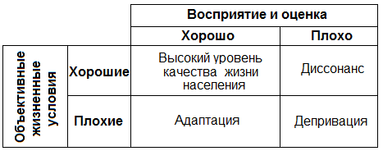 Большинство городского населения, например, западноевропейских стран имеет сочетание хорошие/хорошо и относится к группе населения, имеющего высокий уровень качества жизни. Группа «депривация» представляет собой классическое поле деятельности для проведения политики социальной защиты, деятельности общественных фондов и благотворительных организаций. Группа «диссонанс» является источником протеста и социальных изменений. «Адаптация» часто представляет собой в реальности бессилие и социальное отступление.