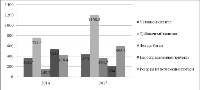 Рисунок 2.4 - Структурное соотношение собственных средств филиала «Дальневосточный» АО «ОТП Банка» за 2014-2015 г.г.