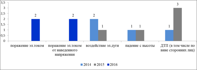 В 2016 году 2 случая травмирования персонала произошли в ЗРУ 10 кВ подстанций 220, 500 кВ и 2 случая травмирования от наведенного напряжения на ВЛ 220, 500 кВ.