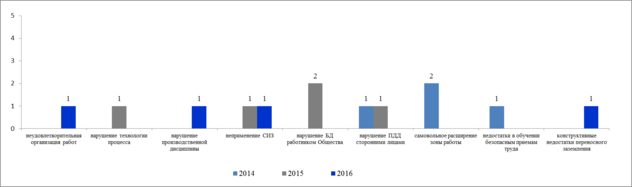 Рисунок 6.11 - Распределение по основным причинам возникновения несчастных случаев в филиалах ПАО «ФСК ЕЭС» за 2014-2016 годы