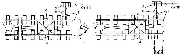 Расположение очагов заземления а - у концов пути; б - вдоль пути 1 - заземляющий проводник; 2 - путь; 3 - кран; 4 - перемычка; 5 - распределительный пункт; 6 - четырехжильный кабель; 7 - очаг заземления