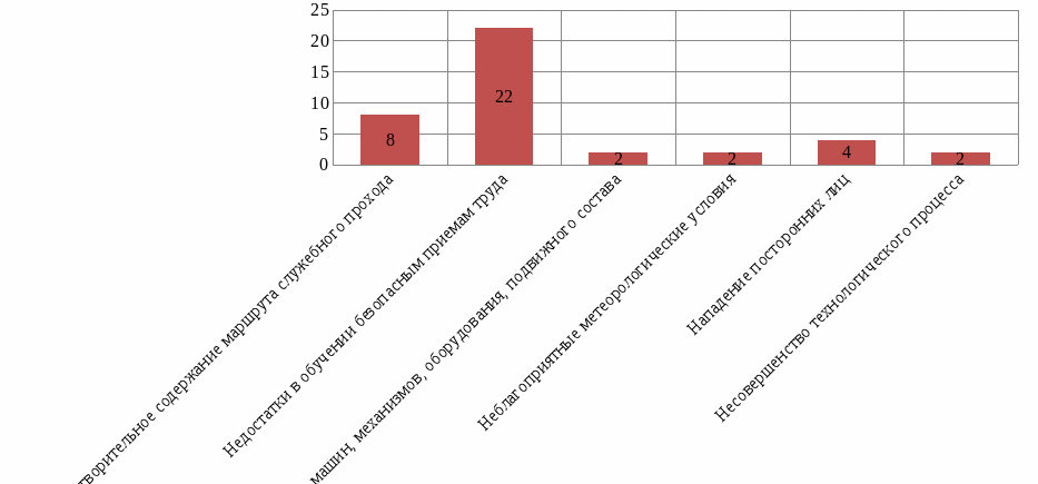 Организационные причины – неудовлетворительное содержание маршрута служебного прохода (20%); недостатки в обучении безопасным приемам труда (55%); нападение посторонних лиц (10%).