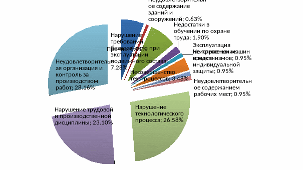 Организационные причины, это причины, которые целиком зависят от уровня организации труда. К ним относятся: неудовлетворительное содержание зданий и сооружений; нарушение требований безопасности при эксплуатации подвижного состава; недостатки в обучении по охране труда; не применении средств индивидуальной защиты; неудовлетворительное содержание рабочих мест; нарушение технологического процесса; нарушение трудовой и производственной дисциплины; неудовлетворительная организация и контроль за производством работ.