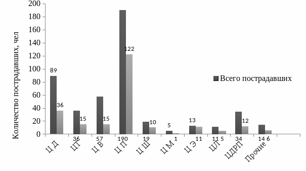 Первое место по наезду подвижного состава занимает Центральная дирекция пути и сооружений (ЦП) - пострадало 190 человек, что составляет 40,6 % от общего числа пострадавших;