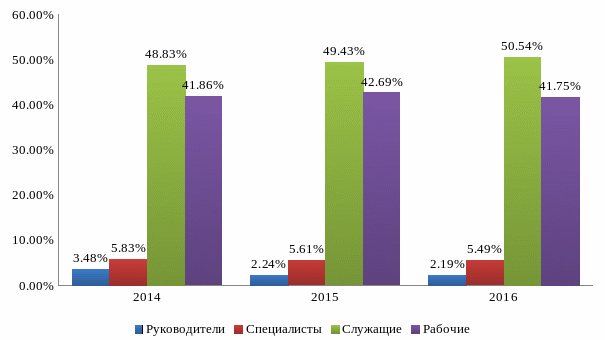 Рисунок 6 – Структура персонала по категориям за 2014 – 2016 годы