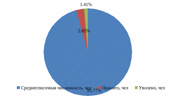Рисунок 7 показывает, что среднесписочная численность вокзала Хабаровск – 1 в 2014 году составляла – 94% (66 человек), численность принятых работников составляла 3% (2 человека), численность уволенных работников составляла 3% (2 человека).