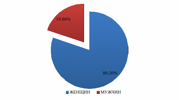 Рисунок 10 показывает, что женщин преимущественно больше, чем мужчин. Количество женщин составляет 80,2% (73 человека). Численность мужчин составила 19,8% (18 человек).