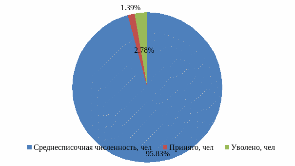 Рисунок 9 показывает, что среднесписочная численность вокзала Хабаровск – 1 в 2016 году составляла – 96% (69 человек), численность принятых работников составляла 1% (1 человек), численность уволенных работников составляла 3% (2 человека).