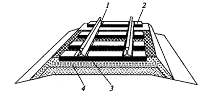 1 – рельс; 2 – шпала; 3 – промежуточное рельсовое скрепление; 4 – щебеночный балласт.