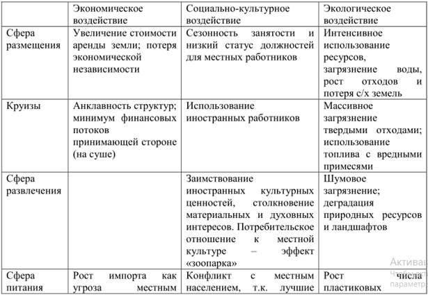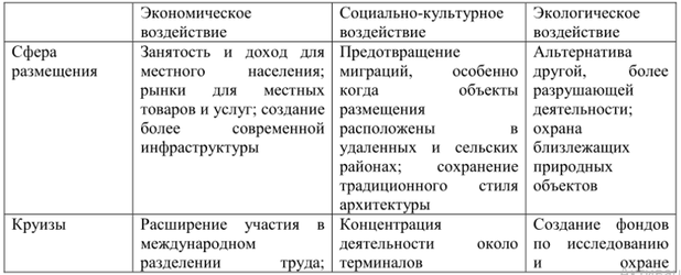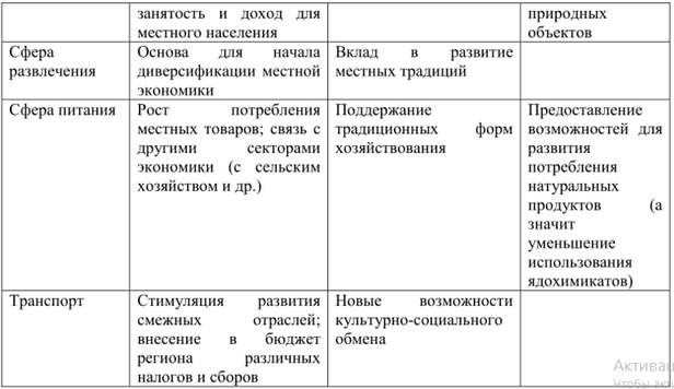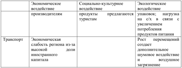 Развитие туристского комплекса и туризма в регионе не только положительно, но и отрицательно влияет на экономическую, социальную и экологическую составляющие. Остановимся подробнее на некоторых из них и выделим положительные (с точки зрения устойчивого развития) и отрицательные стороны их деятельности.