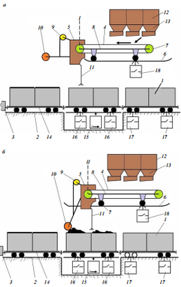 Загрузочные устройства состоят из бункеров 12, качающихся питателей 13 и конвейера 4, смонтированного на тележке 8 с катками 7 для качения по полотну 6. Фиксация передвижного конвейера 4 в начале и в конце загрузки контейнера 1 производится посредством путевых выключателей 18, установленных под полотном 6 и срабатывающих при наезде реборды катка 7 тележки 8 конвейера 4. На передней части конвейера 4 установлена разгрузочная воронка 5, которая оборудована подъемной лебедкой 9, предназначенной для опускания и подъема катка-уплотнителя 10, а также уровнеме