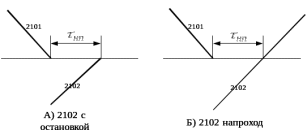 - минимальное время от момента прибытия на станцию однопутного участка поезда одного направления до момента прибытия на эту станцию или пропуска через нее поезда встречного направления. Интервал неодновременного прибытия представлен на рисунке 3.2.