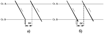 Рисунок. 5.2. Схема интервала попутного следования: а) при остановке поезда 2001 на станции Б и проследовании станции А поездом 2003; б) при проследовании поезда 2001 станции Б и проследовании поездом 2003 станции А
